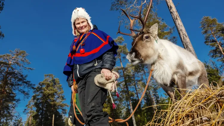 Solen strålar över det vackra vårvinterlandskapet, när fransmannen David Rubin leder den tama renen över skaren. Promenaden går från renhägnet, genom skogsdungen mot den frusna älven. Där skaren inte