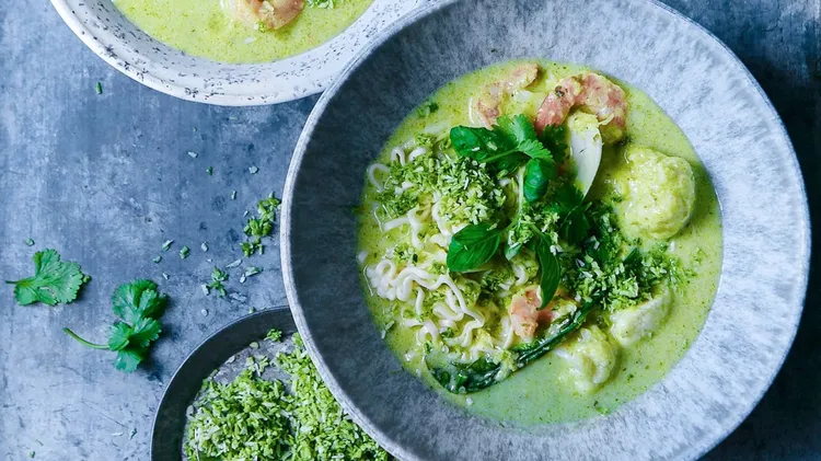 Härligt aromatisk curry med kokos och lime, som känns både värmande och fräsch. Scampin kan bytas ut mot frysta, skalade räkor som läggs i precis på slutet. 4 portioner 400 g blomkål 2 pak-choi 2 sall