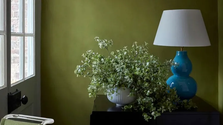 En färgpalett i duvblå nyanser och förgyllda möbler ska
