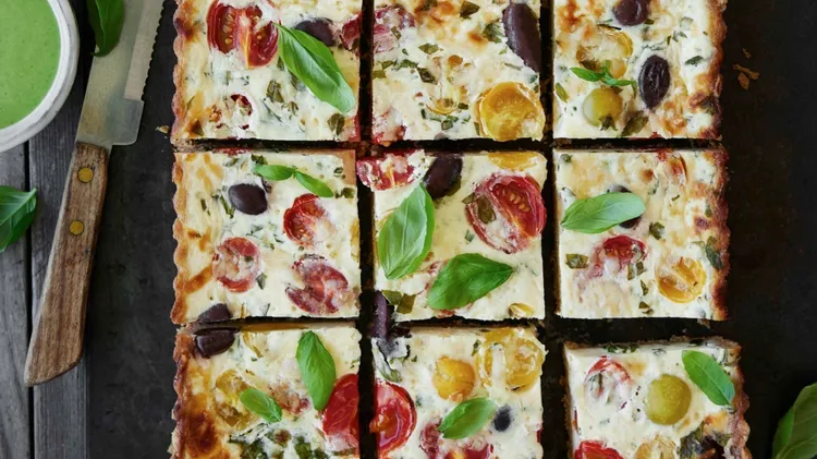 30 min + 20 min i frys + 45 min i ugn Den här pajen får extra krämighet av ricotta i äggstanningen. Tomaterna blir söta och goda när de ugnsbakas, och kalamataoliverna bryter av med lite sälta. 4 pers