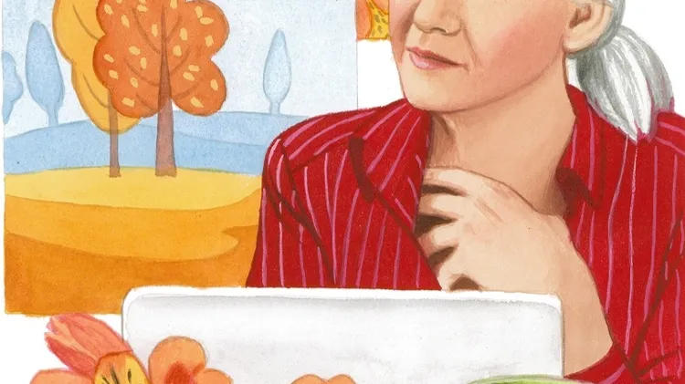 Här framför fönstret med utsikt över höstens färger i trädgården hade Sandra inrett sitt nya trevliga hemmakontor. Utanför, bakom häcken i bakgrunden, bröt en strimma gyllene ljus igenom den mörka nat