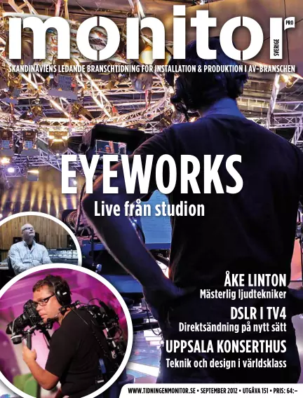 Uppsala konserthus Uppsala Konsert & Kongress har visionen och uppdraget att vara något utöver det vanliga. Bland annat är målet att ”inta en tätposition bland motsvarande anläggningar i landet och i Norden samt kunna mäta sig väl på internationell nivå.” Monitor var med på plats och upplevde. Eyeworks studios Eyeworks är ett internationellt TV-produktionsbolag som gör produktioner för alla TV-kanaler, bland annat BingoLotto, Faddergalan, Postkodsmiljonären och så vidare. I Sverige är deras studios förlagda i Göteborg och Monitor tittar in på reportage. De stora ljudteknikerna del-1 Vi inleder vår artikelserie om framgångsrika svenska ljudtekniker och ljudproducenter. Åke Linton är först ut. Läs om hur intresset blev hans yrke med inspelningar i både Sverige, USA och Australien och hur han blev ”medlem nummer 4” i Esbjörn Svenssons trio. Live med DSLR Att DSLR kameror numera används till filmning är allmänt känt. Men när TV4 drar igång direktsändningarna från fotbolls-EM i Stockholmstudion går man in på ny, oupptäckt mark. Allt man ser i TV-rutan kommer från stillbildskameror från Nikon! Släng upp det i molnet! Moln är inte bara ett kännertecken på svensk sommar, det är också ett sätt att lagra information. Från att ha använda olika slags lagringsmedia i datorn, på bokhyllan eller i källaren, kan vi nu överväga att flytta upp det i det virtuella molnet. Men hur säkert är det? Vilka alternativ finns? Nästa steg i fältinspelning? Amerikanska Zaxcom siktar på nya marknader för fältinspelare med nya modellen Nomad. Den spänner bågen ordentligt och siktar på att vara en lösning för alla som kan öppna plånboken. Monitor letar i menyer, mäter och testar på fältet! Förändringens vind för Grass Valley När Grass Valley bjuder till Berns är det för att ladda om och ladda nytt. Framtidens horisont rycker närmare. Internet förändrar spelplanen och den som ska vara med måste tänka förbi gamla strukturer. Vad anser Grass Valley är framtiden, upplösning eller 3D? Internet? Trådlöst på operan! Malmö Opera var det första konserthuset i Europa som bytte från analogt till digitalt ljud. Sony DWX Wireless Digital System tillför en helt ny ljudbild för teatrar och konserter. Malmö Opera är ett bra exempel. Monitor fick vara med och uppleva det trådlösa ljudet. Direktsändning av TV - för de mindre tillfällena Vi provar en ny produkt från Blackmagic, ATEM Television Studio. Det är en intressant produkt som passar bra för skolor och offentliga lokaler, direktsändning från kommunfullmäktige, kyrkan eller andra evenemang. Men ge den inte bara till vaktmästaren! Live broadcast LEDAREN PRODUKTNYHETER BRANSCHNYTT GALLERIAN