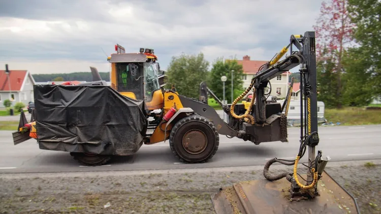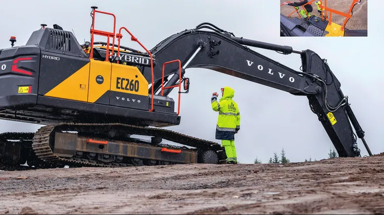 Vi larvar upp på kullen och börjar flytta massorna med Volvos 26-tons bandgrävare. Våra testmaskinister, Christian och Conny, har granskat den stora svarta lådan med cylindern som är kärnan i hybridte